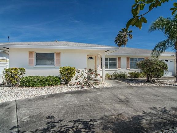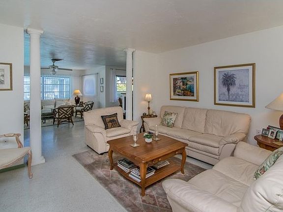 Excellent waterfront location for this move in ready 2 bedroom 2 bath 1 car garage pool home in desirable San Remo shores! This well maintained block construction property offers sweet Florida curb appeal and plenty of parking with it's circular drive and other parking pad. Just bring your toothbrush and enjoy this clean, open floor plan home with terrazzo floors through out. Open and airy floor plan, as well as a nice covered and screened patio by the pool. Ac about 1 year new. Nice low maintenance landscaping. Deep boating water with easy access to the Gulf, while only a 3 minute drive to the beautiful beaches of Anna Maria Island.