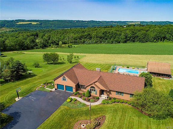 Spectacular in so many ways. There are gorgeous views and sunsets on the 14 acres. This custom built Kevin Stack house boasts of quality workmanship and spacious rooms. Over 3000 sf + 1987 sf in bsmt. An unbelievable outdoor oasis features an in ground pool, hot tub, fire pit, pool house (w/ party room) and barn. Plus, solar and geothermal energy systems resulting in extremely low utilities. It doesn't stop there. Vaulted ceilings; updated kitchen; large loft area ideal for teen suite, office or family room; enclosed sun porch; deck; patio; finished walk-out basement adding additional office area & bedrooms with full bath...the list goes on. There is a workshop, shed and plenty of storage. (Currently 2 bdrms have been turned into in-law suite but could easily be converted back.)