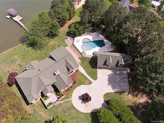 A private paradise with panoramic views! Exceptional main-channel waterfront home on hard to find "level" 1.28-acre lot w/255'of shoreline. Magnificent sunrises and natural splendor including the occasional gray heron perched along the shore. The home is equally impressive, just under 5000 sqft, with updates & improvements. Two Owner's suites: one on main level, the 2nd is upstairs, both provide gorgeous lake views! A stunning kitchen, with custom cabinetry, granite, island prep-sink & gas stove w/dual ovens. Chase away winter's chill in the cozy den w/wood-burning fireplace or opt for the sunroom with its wall of windows and morning sunshine. Enjoy hot summer days in your lakeside pool w/2 sun-deck lounge areas & cool deck patio. Detached 3-car garage with half bath on main & expansive (752 sqft) finished recreational area above! You'll notice hints of world travel including the Bali lava-rock fountain pool side. Quick commute to Charlotte & Clover schools!