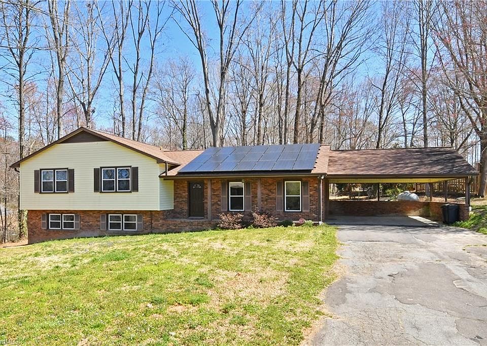 Fantastic offering in Kernersville within the beautiful Pine Knolls neighborhood -- with optional golf & pool memberships available; Beautifully renovated eat-in kitchen w/new cabinets, granite counters, backsplash & flooring; Great room w/fireplace; Delightful sun room (not heated) overlooks back yard; MBR w/private bath -- updated w/glass-enclosed tile shower; Other BRs share updated hall BA; Daylight/walkout LL w/finished rec room + unfinished storage; 2-car carport; Quiet street ends in a cul-de-sac!
