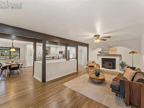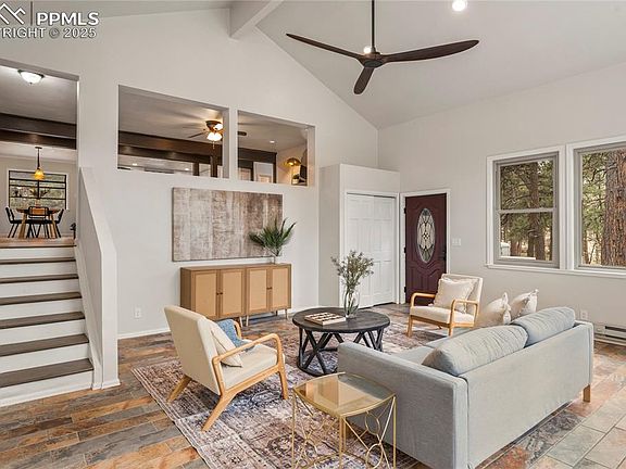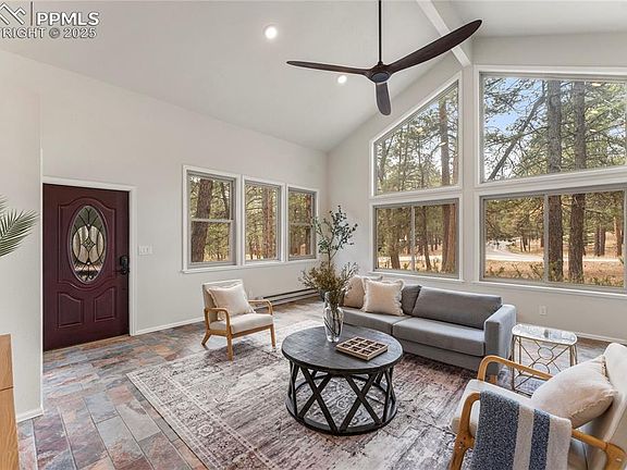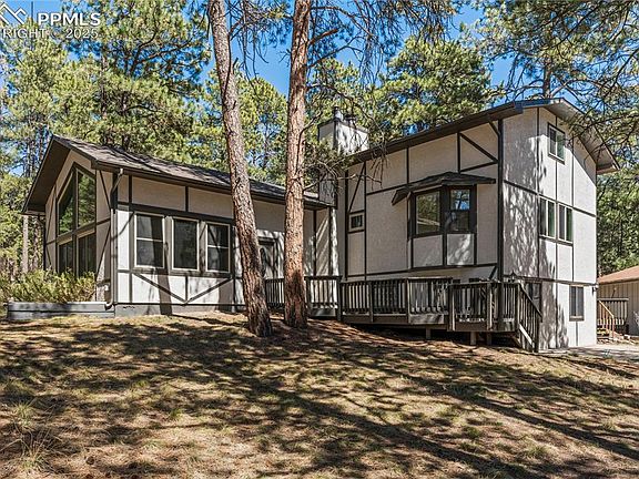 Nestled beneath a canopy of towering pines in the heart of Black Forest, 3815 Highview Drive invites you to slow down, breathe deep, and savor the serenity of Colorado living. Set on a peaceful 1.13-acre corner lot in the coveted Walden III community, this fully updated sanctuary offers a rare blend of nature, space, and thoughtful design. Step inside and you’re greeted by sun-drenched vaulted ceilings, dramatic beams, and a wall of windows that frame your wooded surroundings like art. The heart of the home—a remodeled gourmet kitchen—features bold, patterned tile, silver pearl granite countertops, and an oversized island perfect for morning coffee or evening gatherings. Flowing seamlessly from the kitchen is a warm and inviting main living area with refinished wood floors, a wood-burning fireplace, and stylish accents like crown molding and contemporary fixtures. Just above the secondary bedrooms, a bonus loft offers the perfect perch for a reading nook, play space, or creative studio. This home lives large—with six spacious bedrooms, four bathrooms, three laundry rooms and including a fully functional secondary suite with kitchenette, laundry & private entry. Whether you're hosting guests, managing a rental, or welcoming a multigenerational family, the flexibility is built in. The primary suite is a retreat in itself, complete with treetop views and a serene, spa-inspired 5-piece bath. And tucked thoughtfully throughout the home are abundant storage areas, including a dedicated five-year pantry and extra room for gear, hobbies, or prepper-style provisioning. Step outside and let your imagination roam. A 64-foot deck offers the perfect outdoor living space, while the fully fenced yard features a whimsical playhouse with electricity—a dream setup for creative kids.
