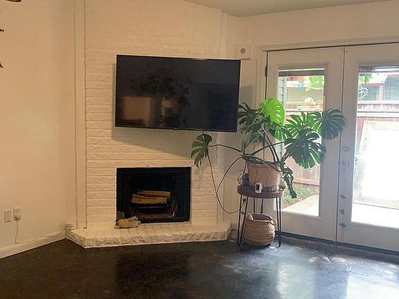 Available beginning in February. Tucked away as a private end unit in a peaceful gated community, this charming condo offers tranquility and privacy, with just one next-door neighbor. Enjoy modern living with stained concrete floors, smooth walls and ceilings, and a fireplace. A TV mount above the fireplace allows for flexible living room setups, and a 60-inch LG smart TV is included. The bathroom features a walk-in shower, complete with a glass wall, door, and steam vent. Also in the bathroom is a stacked electric washer and dryer that is only 2 years old and in great condition. You'll have access to a serene community pool just 30 yards away, while your designated parking is only 20 yards from the front door. Fully accessible and thoughtfully designed, the condo has no stairs, making entry easy. Inside, find ample storage in the spacious bedroom walk-in closet, bathroom, and private patio storage. With well-maintained appliances and surrounded by nature's sounds, this is a relaxing oasis to call home. The bedroom is shown as blue in the photo, but it is now painted the same bone white color as the rest of the condo, and it also has smooth walls and ceilings. Outside of the French 2 doors are a large private patio and storage shed.