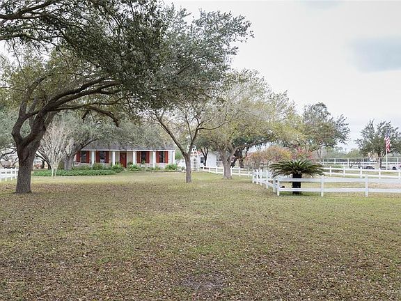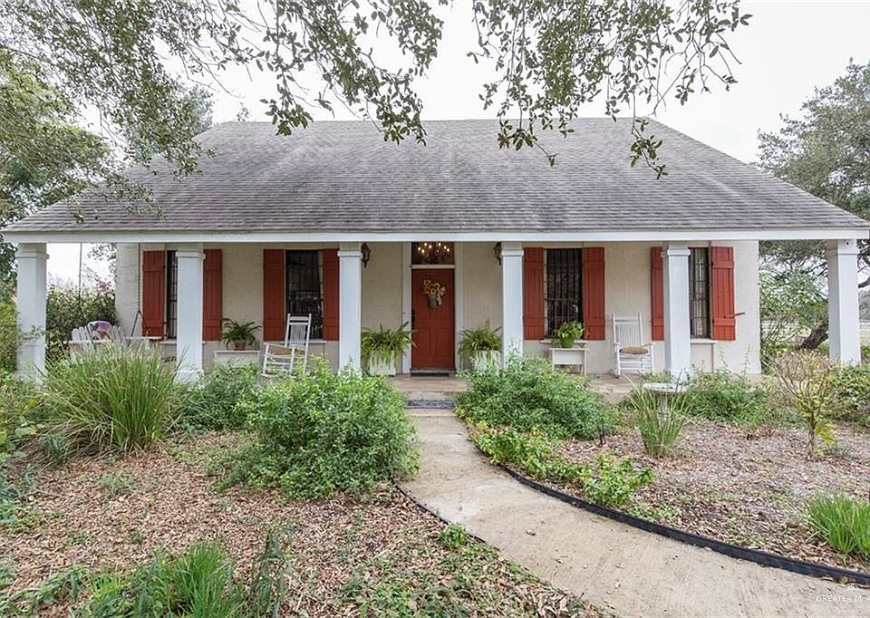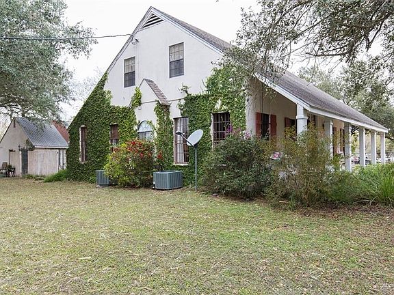 Tucked away, down a shaded private driveway of tons of mature trees is this Gorgeous 1970's Farm Style Home! Home is conveniently located a couple of blocks form expressway 83 on Val Verde Rd. A covered porch complete with swing is the perfect place to spot native birds and enjoy the country breeze. Over 100 year old solid vintage wood doors, European hardware and banister from New Orleans accent the foyer. Features include: saltillo tile flooring throughout, 10ft. ceilings, rich wood trim, and a multitude of french windows in two living areas. A faux carved wood fireplace is the focal point of a formal dining room and old world stucco walls. A charming kitchen has a barndoor pantry, wooden counters and island made of recycled wood from a Louisiana train station. A detached garage with man cave and workshop on 2.65 acs. As you walk outside back of home there is a courtyard that leads to a cottage home, an RV pad Site and a two story Tree house in the back. Home has tons of potential.