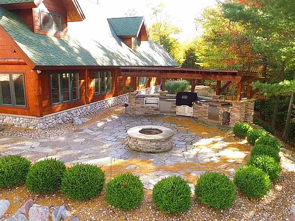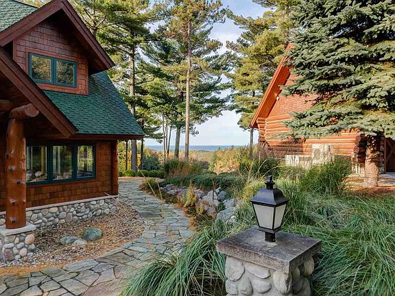Spectacular custom, fully furnished Log Home w/stunning views of Lake Michigan, nestled high on 21.26 rolling, wooded acres that extends to M-22 (a designated "National Scenic Drive") is meant for entertaining both inside and out. This 3,504 sq. ft. log home is an exquisite show case of architectural design with fine authentic handcrafted built-ins. Guests arrive under a portico, sheltered from the elements, to an open and spacious floor plan with a natural stone fireplace and vaulted ceilings. Master suite includes glass block shower and claw foot tub. 2nd bath has steam shower and sauna. Upper level is an open loft with seating and sleeping areas. Walk-out lower level offers a natural stone fireplace in family room, bathroom and 2 bedrooms, one which sleeps 6. Home features hot water heating system, air conditioner, generator and high speed internet. The attached 2 car garage is heated and has radiant heated floors. An extra bonus is the 3,540 sq. ft. media/dance/exercise building equipped with its own hot water heating system and air conditioning. The state-of-the-art theater room seats 12 and upper level offers guest quarters. Highlights of this property include extensive stone landscaping and sprinkling system. A custom stone outdoor kitchen and dining area for entertaining large groups is complete with sound system and bonfire area. Detached 30' x 40' heated garage/work shop has a 17' door to accommodate large boats. To the right of this building are trails that lead to M-22 and to the right of this trail is a large cement storage pad. A gentle stroll down a lit stone trail brings you to a surprising end at a $100,000 heated "Tree house" that sleeps 5. This stunning compound is only minutes from Arcadia Bluffs Golf Course and Crystal Mountain Golf/Ski Resort & Spa.