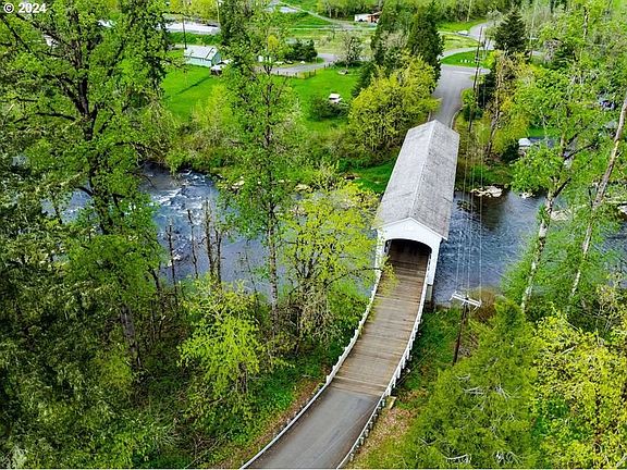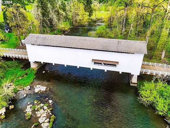 Quaint Fall Creek location off the Pengra Covered Bridge, this property features superb living spaces like a large, bright, window-filled family room with a certified woodstove and covered patio and firepit. Lots of flexible, separate space for dining room, office/den, or potential for a third bedroom. Primary bedroom has its own bathroom. Laundry room is inside the house. Washer and dryer, play structure, and chicken coop stay. The almost 3 acre level lot has plenty of RV and vehicle parking, a barn, and pasture. Giant, deluxe workshop has tons of potential with tall ceilings, banks of electrical outlets, ductless heat pump, engine hoist and storage loft. High speed internet available. 2020 home inspection described roof as "newer", and septic, well flow and water quality reports were excellent. If country living is your idea of paradise, come see this property!