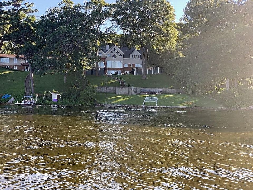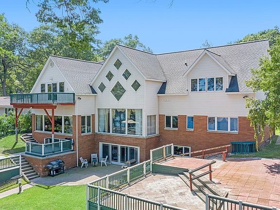 Just picture yourself standing in the entrance of this newly renovated luxury home as you view the calm lush landscape of Mona Lake. You can take in the majestic landscape of the surrounding woods while viewing the sky and lake from behind uniquely structured windows with the extra privacy afforded to you by your own private one-way cul-de-sac. This exquisitely beautiful 7968 sq ft home is integrated into its natural surroundings effortlessly, which allows you to walk right out to the lake from a multipurpose room; that could be perfect for a home gym, yoga studio or extra entertainment space, it's really up to you. Once you can drag your eyes away from the view outside, you will be captivated by the open living areas which feature cathedral ceilings, three-sided fireplace (one of the two), wet bar and chic architectural features that you must see, to appreciate. The newly renovated kitchen features modern upgrades including a 48'' sub-zero refrigerator, Viking range, and granite