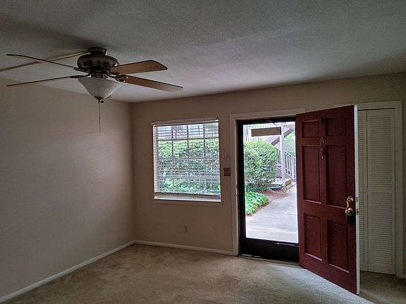 Main level condo. Fresh paint, luxury vinyl plank in living and kitchen/dining. Carpet in bedroom. Central heat and air with heat pump. Stove, refrigerator and dishwasher included. Hot and cold water provided. Tenant pays electricity. One year lease.