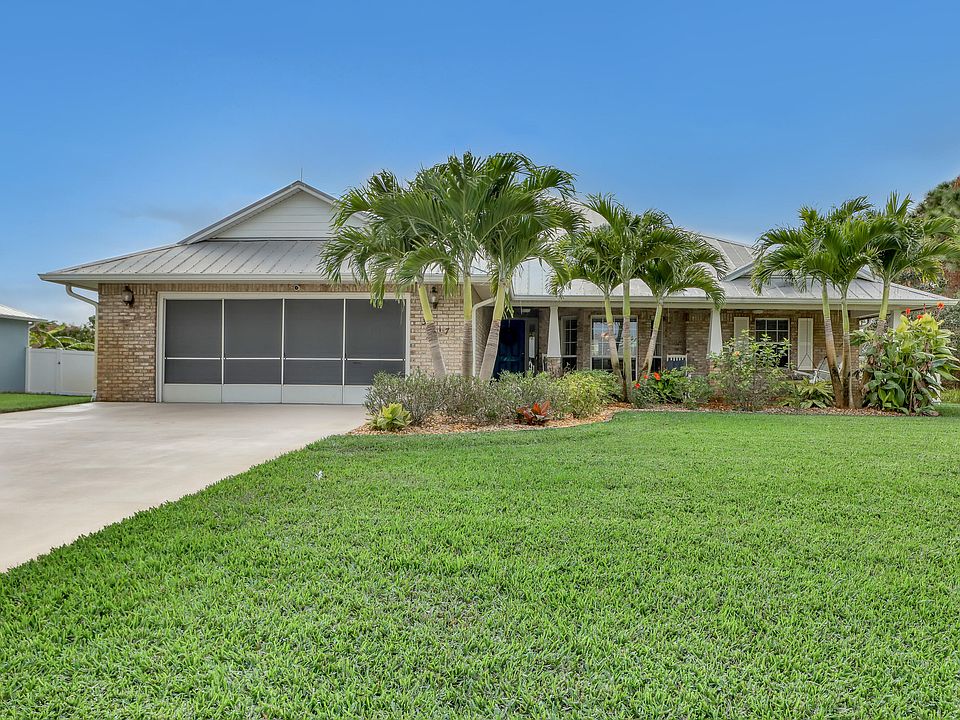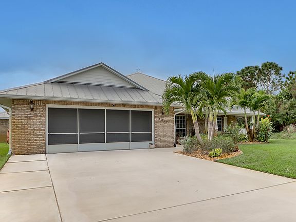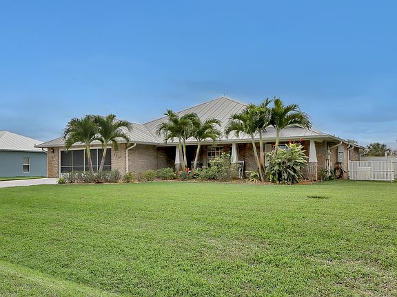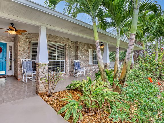One of a kind custom built 4 bedroom 2 bathroom pool home, just minutes from the Indian River. Solid concrete block construction, with a beautiful brick exterior and metal roof. The homes spacious open floor plan, with a large eat in kitchen, is perfect for entertaining. Cathedral ceilings and outdoor access from almost every room, further open up the space. The split floor plan provides privacy for the primary bedroom suite, featuring two large walk in closets, dual vanity's, an extended shower, and even it's own flex room with outdoor access! Enjoy outdoor living from your screened-in lanai, with a large pool and waterfall. Morning coffee is great on the front porch swing, with views of tropical landscaping. With a 2021 Generac, recently replaced irrigation pump and lines, walk in closets in every bedroom, and more, this home is a must see.