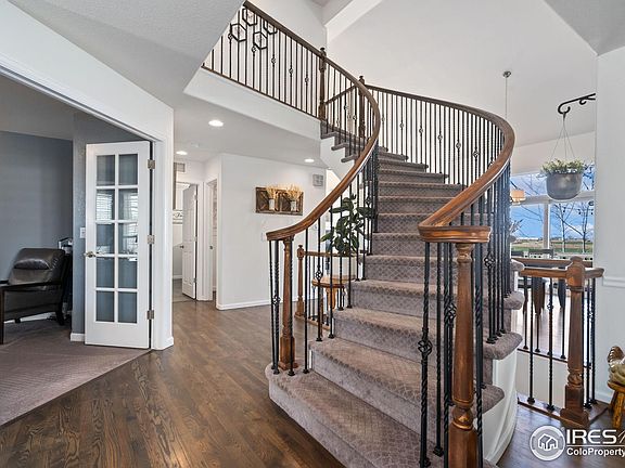 Welcome to this beautifully updated 5 bed 4 bath home on 1/4 acre lot with foothill views! This location is perfect for those commuters who need easy access to I25 as well as all the great new shopping nearby. This home backs to HOA-owned open space and is blocks away from Johnstown Reservoir! As you enter, you will find beautifully refinished solid hardwood floors and newer carpet throughout main floor. An elegant formal sitting room, formal dining room, and charming staircase complete this grand foyer. As you make your way through the home, you will come to a stunning eat-in chef's kitchen with gas cook-top, double wall ovens, wine/beverage fridge, an abundance of stylish Lamberti Bianco Quartzite countertop space, and marble backsplash. This room is joined with a great sized family room with beautiful gas fireplace. To finish off the main floor, you will also find a sizable office, powder room, and fantastic laundry room. The updates continue upstairs where you have a very large primary suite complete with his and hers walk-in closets and an updated 5-piece primary bath! In addition to the primary space, there are 3 great sized bedrooms and another full bathroom with double sinks! The basement is where all the fun happens! Enjoy your updated theater room including all equipment, a completely renovated 3/4 bathroom, game room including pool table, ping pong top, and tv. Also in the basement is an additional large guest bedroom and large storage room! This home also features an oversized 3 car garage with plenty of storage for a boat or other toys! Schedule your showing today!