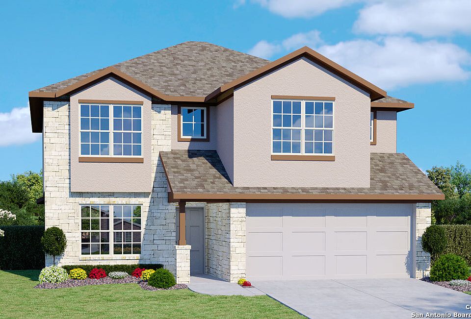The Lombardi is a two-story, 2539 square foot, 5-bedroom, 2.5 bathroom, 2-car garage layout. A deep-set, covered porch opens to a foyer, formal dining room, and powder room. A butler entry connects the dining room and spacious kitchen lined with abundant cabinet and counterspace. Classic white subway tile backsplash is a perfect accent. The large kitchen island faces the family room. The private main bedroom suite is located off the family room and features a separate tub and shower, double vanity sinks, ceramic tile flooring, private water closet and a large walk-in closet. A downstairs utility room is located off the entry foyer and a storage space is located under the stairs. The second floor includes a versatile loft area with plenty of natural light, a full bath, four secondary bedrooms, and spacious closets. Additional features include 9-foot ceilings, 2-inch faux wood blinds throughout the home, luxury vinyl plank flooring in entryway, family room, kitchen, and dining room, ceramic tile at all bathrooms and utility room, pre-plumb for water softener loop, and full yard landscaping and irrigation. You'll enjoy added security in your new home with our Home is Connected features. Using one central hub that talks to all the devices in your home, you can control the lights, thermostat and locks, all from your cellular device.