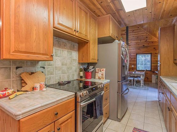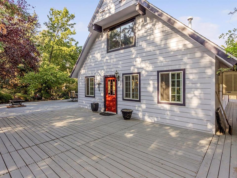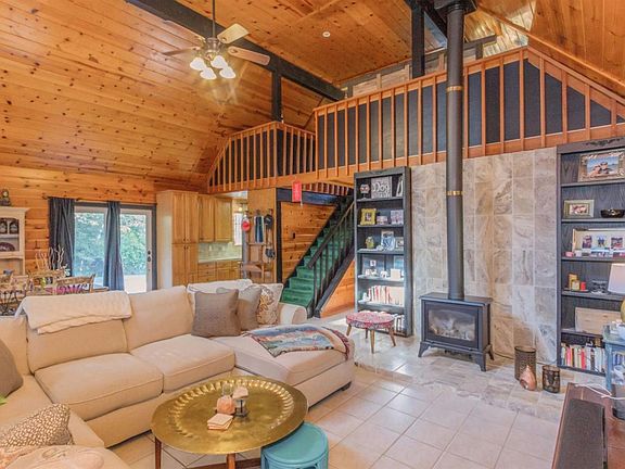 This home will make you feel like you're getting away from it all! Beautiful rustic interior with pine siding and high ceilings, and a large upper loft that is being used as the third bedroom. The home is tucked away and private with a huge deck and a koi pond to the side. The land is very usable and fenced, and there is a greenhouse, chicken coop, and a large barn with a wonderful shop set up.