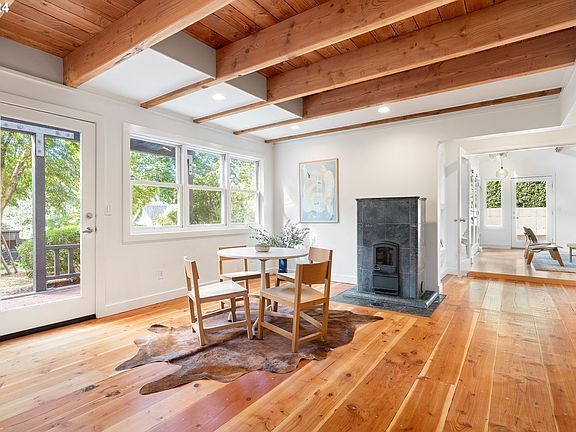 Magical Scandinavian modern farmhouse in the heart of Multnomah Village.Modern design elements are perfectly paired with warm, natural wood and stone finishes that create a calm and cozy environment throughout. Multiple windows and glass doors flood the interior with natural light and bring the outdoors in.The open kitchen is the heart of the home with a large wood block island, quartz counters with plenty of prep space and a large walk-in pantry.The adjacent living and dining spaces feature wide plank wood floors, wood ceilings with exposed beams and a Tulikivi radiant soapstone fireplace keeping the main floor cozy year round. The connected gathering/flex space has a dramatic vaulted ceiling with exposed natural beams creating a soothing aesthetic perfect for an art studio, lounge space or office plus built-in shelving and glass french doors that connect to the gorgeous outdoor space. The second floor features the primary and guest bedrooms (w murphy bed) with a connected bathroom + laundry. The third floor features 2 bedrooms and a full bathroom with a sauna for the full Scandinavian lifestyle experience. The enchanted forest greets you in the front while an open, spacious backyard features a large grassy area, beautiful hardscape planters with established plantings + integrated lighting plus a chicken coop and fruit trees for the urban farmers. The built-in concrete fire pit is ready to host cozy gatherings, a covered brick patio for enjoying the outdoor space in all seasons and a large stone patio for entertaining. This magical home is located just minutes to Multnomah Village with local boutiques, restaurants and coffee shops. [Home Energy Score = 3. HES Report at https://rpt.greenbuildingregistry.com/hes/OR10187083]