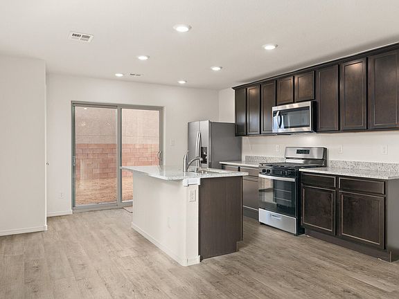 The charming Ironwood plan at Vistas at Huning Ranch features three bedrooms, two full baths, a two-car garage, and a fully fenced back yard. The chef-ready kitchen is the heart of the home and boasts sprawling granite countertops, a full suite of stainless-steel appliances, including a gas cooktop, a large single-basin sink, and stunning cabinetry with crown molding. Connected to the dining area and expansive family room, this open-concept layout creates the perfect space for spending time together as family, whether you're cooking, eating, or watching tv. The Ironwood was designed with your family in mind!