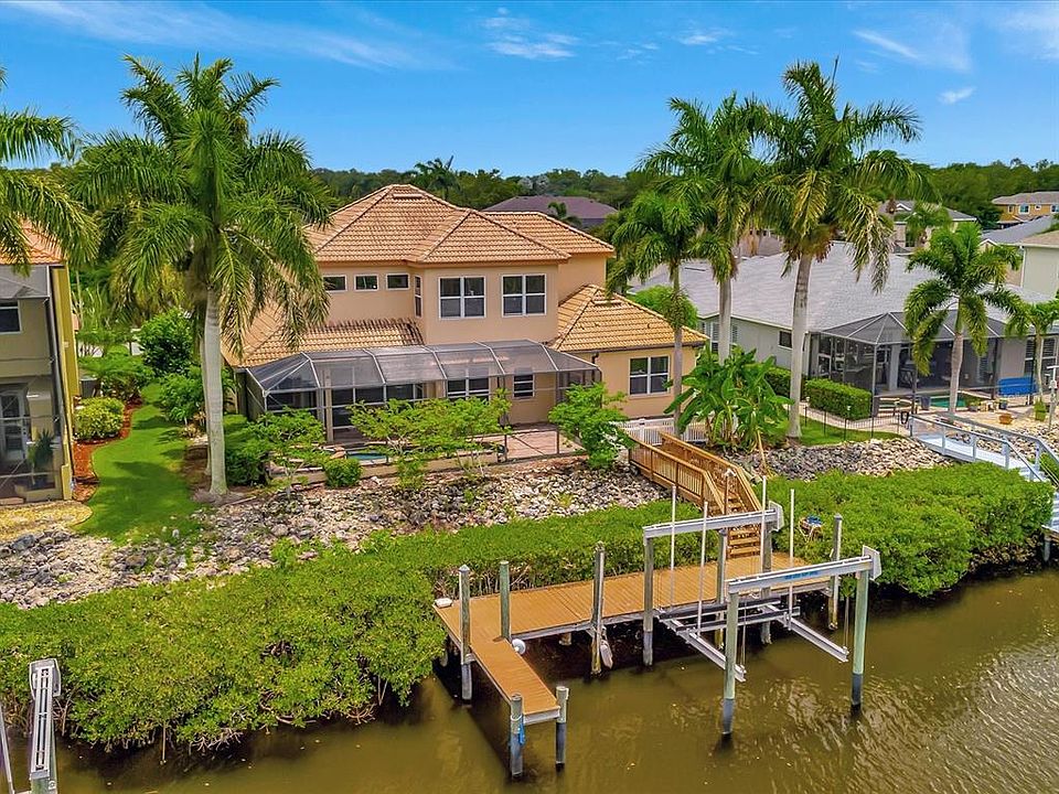 One or more photo(s) has been virtually staged. Welcome to this stunning Camlin-Built custom waterfront home. Entering this 2-story home, you are immediately amazed by the soaring ceilings that add drama & natural light that filters in from the impressive windows & doors overlooking the water. The first floor features a luxurious Primary Suite, and a Guest suite with a pool bath, a separate Den, and a Dining Room adorned with crown molding. The Breakfast Nook, with a charming window seat offers serene views of the pool and saltwater canal. The Great Room is a showstopper with its cathedral ceiling and sliders to the pool area. The oversized Primary bath Suite includes a step-down garden tub, a separate shower, his-and-hers closets, a wall safe, crown molding, plantation shutters, and sliders that open to the lanai. For culinary enthusiasts, the chef's kitchen is a dream come true, featuring a large island, breakfast bar, pot hanger, and walk in pantry. The Great Room and Lanai are wired for surround sound, perfect for entertainment. Added features: new hot water tank 2024, new interior paint 2024. Upstairs, you'll find two additional bedrooms, one with wood floors and a fantastic view of the canal, Hawk Island, and the Manatee River in the distance. The home also includes a two-car garage with a separate storage room and a double porte-cochere for added coverage and convenience. The large screened-in patio, complete with a paver deck, heated spa, and pool, offers endless opportunities for entertaining, relaxation, and enjoyment. A stroll down the walkway leads to your private dock with a 12K lb boat lift providing direct access to the Manatee River, Tampa Bay, the Intracoastal Waterway, and the Gulf of Mexico. Complimentary Sunsets included! Enjoy the salt life from the pristine pool/spa view of widest, largest, deepest canal w/direct Gulf access one canal over from Manatee River. Fishing enthusiasts? Fish from your private dock or heading to the Gulf of Mexico for world class fishing for snook, redfish & grouper. Explore the waters while canoeing or kayaking, water sports, and jet skiing. A waterfront playground awaits you! After a fun day on the water, relax poolside and feel the tropical breezes & watch the Manatees play. Lush tropical landscaping surrounds this home. Life doesn't get any better than this ... a truly desirable waterfront location-River Pointe with Low HOA fees & NO CDD fees. Easy access to I-75, Sarasota and St Petersburg. Great schools, fine dining & points of interest from world famous beaches & nightlife. Cruise to local island destinations, full-service marinas, yacht clubs. This home embodies the essence of Florida living. It’s an opportunity you won't want to miss. Schedule a tour today and make this waterfront paradise your new home!