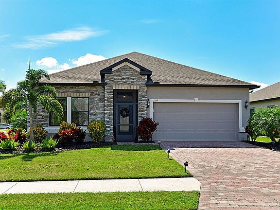 Pride of ownership exudes from this beautiful and bright three bedroom plus den home, situated on a large corner home site with extensive landscaping surrounding the entire property. Landscape lighting really brings this home to life at night as well, it truly is the showstopper of the neighborhood! Brick paver driveway and screened in front porch, beautiful lead-in-glass front door all lead you into a comfortable front seating room that can also be used as a formal living room. The gourmet kitchen includes a built-in stainless-steel double oven, glass five-burner cooktop and convenient center island which opens out to your dining room and great room areas. Granite counter tops, upgraded lighting package, in-wall pest control and bonus laundry room sink are just some of the many upgrades. Privately tucked down a hallway you will find two more bedrooms along with a spacious den area. At the back of the home you will find the owner's retreat with a gorgeous tray ceiling with crown molding detail with views of your shimmering pool. Step out onto your fully covered and screened lanai with remote control operated awning, and casually step in to your large 14 x 24 saltwater pool with expansive sun shelf and enjoy peek-a-boo views of the lake just beyond. Heron Creek has a wonderful central location, perfect for commuters to either Sarasota, St Pete or Tampa areas. No CDD fees and low HOA. This home is truly impeccable, just move right in! Even some of the furniture is negotiable. Priced to sell quickly so this will not last long in this current market. Schedule your private showing today! MULTIPLE OFFERS RECEIVED