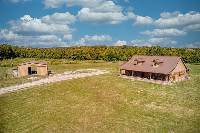 Beautiful ranch style home on over 10 secluded acres in Van Alstyne ISD. The home features a rustic kitchen that opens to a large living room with vaulted ceilings and a fireplace that is a must see. Enjoy nature while working from the home office that looks onto the front yard. Primary bedroom includes decorative ceilings, a large bathroom with an oversized tub, separate shower with his and hers closets one of which opens into a hidden saferoom. The shop has electric along with a additional washer and dryer set up. West of the 35x35 shop there are utilities in place perfect for a mother in law suite, man cave, sheshed, or even a tiny home. Enjoy the countryside views from the front and back porch. Must see!!!