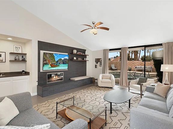 You will feel right at home in this stunning 3 bedroom + 3 bathroom property. It truly is a house that you must see in person to appreciate its beauty! Immediately you are captivated by the serene ambiance in the private courtyard. This home embodies masterful design and modern luxury. Both comfortable and peaceful with warm accents, it is ideal for the most discerning buyer. Perfect for entertaining or simply relaxing, the living room boasts high ceilings, a gas fireplace & a wet bar. The sleek gourmet kitchen balances style with functionalism. It will inspire your inner chef with stainless steel appliances & ample cabinet space. Retreat for the evening to the impressive primary suite encompassing an en-suite bathroom and an abundance of natural light. Each bedroom features its own outdoor patio area and motorized shades. Paradise awaits in this picturesque backyard oasis. The lush greenery and pool/hot tub create a tranquil and peaceful setting. The 2-car garage is currently being utilized as a gaming area with a ping pong & foosball table and a charger for electric cars. The Sundance Villas offers resort style amenities including a community pool/spa, fully lit tennis court, and beautiful mountain views. This is an incredible opportunity to own a fully furnished, successful short term rental property. Surrounded by palm trees and situated close to downtown Palm Springs, this home exemplifies California living at its finest!