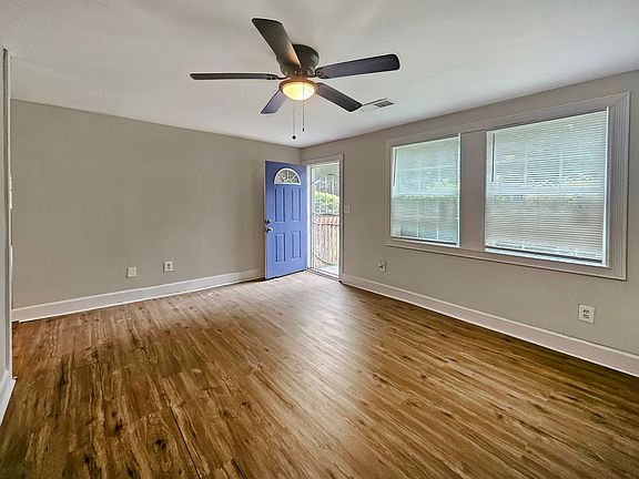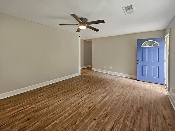 Charming 3-bedroom, 1-bath ranch located in the serene Belieau Woods neighborhood, just minutes from I-75 and Cleveland. This home offers quick access to Hwy 54 (Jonesboro Rd), I-75, I-285, downtown Atlanta, Hartsfield-Jackson Airport, and a variety of dining and entertainment options. Recently updated, the exterior showcases a stylish blue-gray finish, double-pane windows with blinds, and security doors. Inside, you'll find freshly painted light tan walls with crisp white trim, complemented by luxury laminate flooring throughout, upscale lighting, and ceiling fans. The kitchen features a custom tile backsplash, stone-look laminate countertops, and new white cabinets with brushed nickel hardware. Appliances include a refrigerator, microwave, electric range, and dishwasher. A spacious dining area with a brushed nickel chandelier offers easy access to the side and backyard, along with a convenient storage or pantry closet. The wide hallway leads to three generously sized bedrooms, each with ample closet space and ceiling fans or designer lighting. The shared bathroom includes a modern vanity with a designer sink, a large decorative mirror, and brushed nickel lighting. The new bathtub features a molded white surround, with hookups for a stacked washer and dryer. Outside, enjoy a back porch perfect for grilling and a large, open backyard bordered by woods for added privacy. Tenants are responsible for all utilities and trash. No pets. There is a required monthly Tenant Benefit Program Fee of $64.00. We are seeking qualified, long-term tenants and perform full tenant screening and background checks. Requirements and online applications are online at our website.