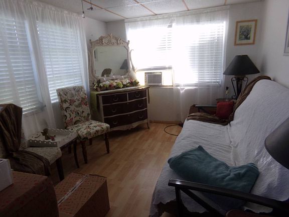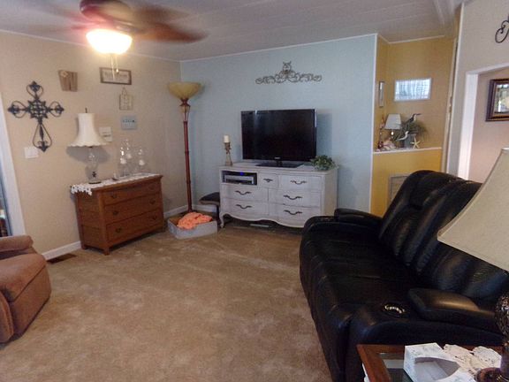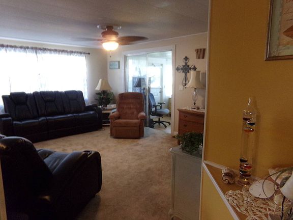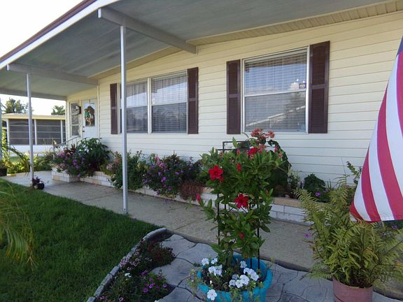 This is a lovely 1977 double wide that has been well maintained and sits on an over sized pie shaped lot. New sub floors were installed throughout the home. Stainmaster water proof laminate flooring is in the kitchen and dining area. Carpeting is in the living area and both bedrooms. Tile is in both bathrooms. The interior of the home has been freshly painted in soft, muted tones. An updated kitchen has a counter where one can have breakfast, lunch or maybe a snack. A formal dining area has a large built-in china cabinet. The large living room can accommodate several sofas, chairs and tables, and has a pair of sliding glass doors that give access to an enclosed sun room. A view of the neighborhood is a feature of the enclosed sun room. Both bedrooms have full wall closets, and the master has an en-suite as well. Off the carport is a storage shed that houses the washer/dryer, rinse tub and affords plenty of storage. The outside has landscaping that gives great curb appeal. Although this home is move-in ready, it does require a new central A/C unit. Located in the age qualified community of Colony Cove. Lot rent is $746.