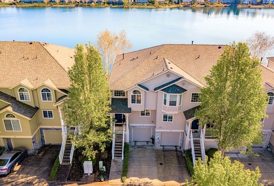 Rare waterfront property! Bright and sunny condo overlooking Staats Lake. Desirable end unit with open floor plan and high ceilings. New flooring. New appliances. Central heating and cooling w/ Google Nest. Gas fireplace. Floor to ceiling two-story windows in living room with motorized blinds. Peaceful and quiet community w/ gorgeous views and great neighbors. Lovely walking path around 60 acre private lake. Gated community. 7 minutes form I-5. 12 minutes from downtown Salem.