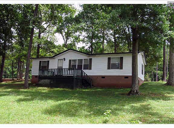 Lake Murray waterfront mobile home with private dock; 98 ft waterfront on .79 acre. Three bedroom, two bath. Exterior has brick underpinning, tin roof, front porch and back deck. Matching detached two car garage, smaller workshop, and circular drive. Sentricon system installed on property. Lot is a nice flat, gentle slope to the lake with mature trees. Well cared for home, sold as-is. Furnishing remain at no cost or value