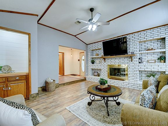 Welcome to this charming home with great curb appeal in a sought after neighborhood. Step inside to find three bedrooms and two bathrooms, perfect for your family's needs. This home boasts several updates, including a remodeled kitchen with stainless steel appliances (refrigerator, dishwasher, stove and microwave), as well as a tiled backsplash. New flooring in the living room and hall. The Sunroom/recreational room off the kitchen is an ideal spot to enjoy your morning coffee or just relax. Large living room with gas fireplace with built-in cabinets on each side. Outside, the property is well-equipped with a privacy fence, storage building and storm cellar for our crazy Oklahoma weather. The roof, only three years old, offers peace of mind for years to come. Don't Miss This One!