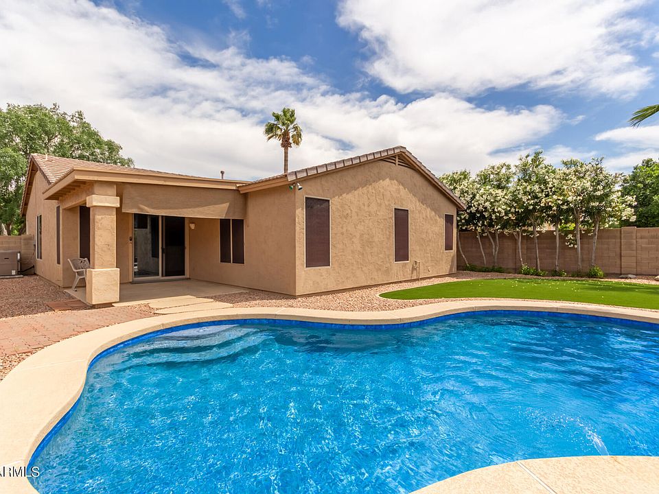 WELCOME HOME! Absolutely beautiful 3 bedroom home nestled in the sought after community of Dobson Place beaming with pride of ownership. As soon as you enter the front door you are greeted by picturesque windows streaming in the natural light and views of the stunning pool. Beautiful new floors and paint throughout this open concept home. Fabulous, extra large Owner's Suite includes two closets, a sitting room, and an ensuite with dual sinks & a separate tub/shower. Create years of memories in the spacious backyard complete with a covered patio, pavers, turf and a sparkling pool! Pool deck, pebble tech, HVAC, water heater, back slider & turf replaced w/in the last 2 years. Exterior paint, shutters, front turf all done w/ in last 5/6 years. Home Sweet Home!