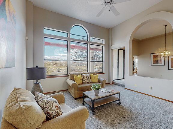 Wow! This fantastic home is drenched with sunlight and has views that will make you never want to leave! Soaring windows and ceilings in the great room that offer loads of room for many set up options! The kitchen is charming with Saltillo tiles and a cozy eat in breakfast nook. There is another living space perfect for Netflix & chill time! The primary bedroom is large with more amazing views of the Sandia mountains. The primary bath has separate tub and shower with ample room. There are two more bedrooms and a hall bath all roomy. The laundry room is right off the large 2 car garage and has a half bath conveniently located right by the garage! The home has had a fresh coat of paint in every room, and carpet has just been installed! The primary bath has new luxury vinyl floors