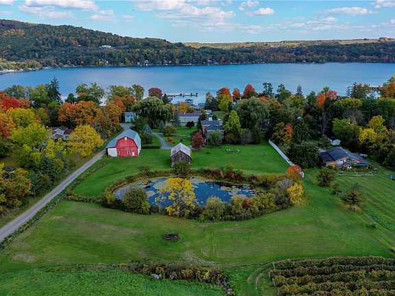 HISTORIC Circa 1850 BRICK FEDERAL STYLE HOME overlooking Keuka Lake, area Marinas and NY State Park for swimming and hiking! Over 4 acres and a secluded pond surrounded by neighboring Vineyards. Currently enjoyed by family and VRBO guests. Referred to as The Willows once surrounded by majestic Weeping Willows. Two still standing tall! The charming Brick beauty of the exterior is matched with a newly remodeled interior that preserves the historic integrity of the property while providing the upscale conveniences of a modern home! 4 comfortable bedrooms plus an office and 2 full baths with Master bed and bath on 1st floor! Spacious and delightful updated kitchen, formal dining room, family room with wood burning stove, 2 front parlors and breathtaking front stairway and hallway leading to open front porch with Keuka Lake view! Updated mechanics throughout with newer furnace, central air and newer roof! Original broad-plank flooring and woodwork detailing. Must see to appreciate this time-honored and stately home in the Heart of the Finger Lakes! Nearby Marinas, Wineries, Breweries , Distilleries, Restaurants and Country Store! A Very Special Finger Lakes Property!
