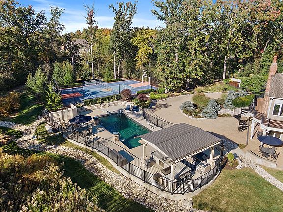 This extraordinary estate offers the perfect blend of luxury, comfort, and entertainment. Nestled on a private lot, every detail has been carefully considered to provide the ultimate living experience, both inside and out. As you step through the grand entrance, you'll be captivated by the soaring ceilings and open-concept design that creates a sense of grandeur. The gourmet kitchen is a chef's dream, featuring top-of-the-line appliances, custom cabinetry, and an oversized island, perfect for both casual dining and entertaining. The kitchen flows seamlessly into the elegant dining and living areas, providing the ideal space for gatherings. The luxurious first-floor master suite is a true retreat. Additional bedrooms are generously sized and offer ample closet space, providing comfort and privacy for family or guests. This home was designed for recreation, with a wide array of amenities that promise endless fun and relaxation. Stay active in the fully equipped exercise room, or enjoy a game on your very own indoor soccer court, state-of-the-art theater room provides a cinematic experience right at home. The spacious rec room with a built-in bar is perfect for hosting game nights or entertaining friends. Step outside to your own private resort. The fully landscaped backyard features an in-ground pool, an outdoor kitchen, and a sport court, ideal for everything from casual play to competitive games. Enjoy the changing seasons in the three-season room, a perfect spot for relaxation, entertaining, or simply enjoying the view of your expansive grounds.