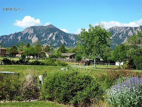 Incredible Flatirons views! Sunny, updated Wellman Creek townhome on open space & trail system! Landscaped yard & delightful patio create a serene retreat. Lovely maple flooring, living room fireplace w/Travertine surround, updated fixtures. Open kit w/gas range, stainless sink, & new refrigerator. Master w/desk nook, xtra closet storage & picture window to Flatirons. Oversized 1-car garage + parking pad. Central A/C. Very quiet & private, HOA community garden, play area, plus free eco passes!