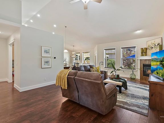Location is minutes from the Village and just off Eagle Rd. This turn-key open floor plan has vaulted ceilings and large windows throughout. The main level master has a spacious room, custom bath with separate shower, soaker tub, dual-vanities and a walk-in closet. Second master is the entire upstairs space with its own large walk-in closet and bathroom. Mature landscaping in the garden has a spa-like stone water feature, covered seating area, built-in BBQ, garden boxes and two sheds. The quiet neighborhood has a park within walking distance. This corner lot is in a desirable location with a circular driveway and has a 4-car garage with a high amp shop set-up in the long 2-car bay. This home has it all! Seller offering home warranty for 1 year to cover whole house including plumbing, electrical, hvac, roof and ALL appliances.