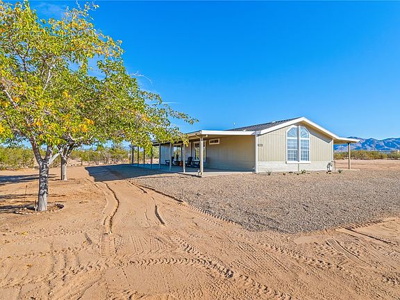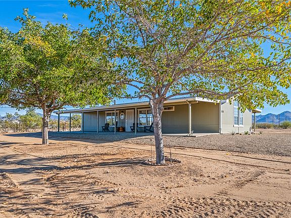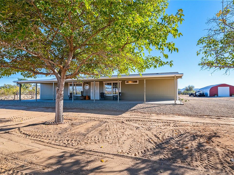 Enjoy the best of desert living on this fully renovated ranch-style property set on 100% flat and fenced, usable land. Upgrades include a new roof, windows, granite kitchen countertops, pink marble bathroom countertops, flooring throughout, rear covered patio and more. Spend your evenings relaxing amongst the mature mulberry trees or entertaining on either front or rear covered patios; guaranteed shade any time of day. A new concrete apron leads to the detached hangar-style garage, and the property sits less than a quarter mile from the paved road, offering easy access yet peaceful privacy.