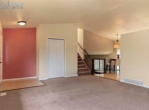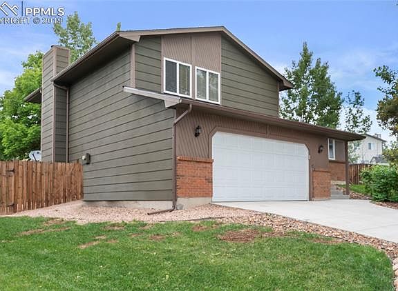 Great open floor plan home on big lot with views of Cheyenne Mountain! Walk in to the living room with vaulted ceilings that extends to the remodeled kitchen and dining area. The kitchen features newer cabinets and countertops, stainless steel appliances, tile floors, a dining area, upgraded lighting and walks-out to the back patio. The upper level features a master bedroom with an attached remodeled bath, two additional spacious rooms and second full bath that has been remodeled. The large lower level family room has a cozy wood fireplace with a brick hearth and a home theater system that stays! A bath and laundry space completes the lower level. The fully fenced backyard has a large patio for outdoor entertaining and a yard for lots of room to play! Other amenities include air conditioning, wrought iron railings, skylights and a convenient location near parks and schools and easy access to Fort Carson.