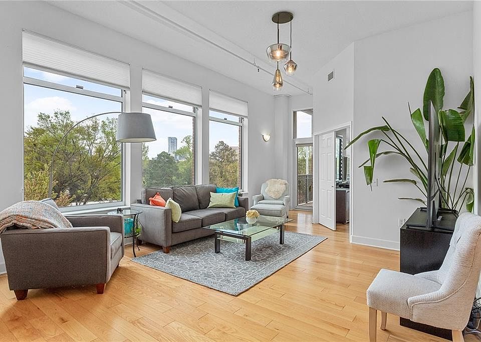 Best Floor plan in the Building! Sought after rare corner unit with perfect southern and western views!! This loft style condo is filled with natural light and exposed ductwork to give it that modern industrial touch anyone will love! With hardwood floors throughout, the modern kitchen has floating shelves, custom vent hood and upgraded appliances, opens to the living and dining room giving it an open floor plan desired by most. The entry hallway makes it feel like a home when you come in! A large pantry/storage room off of the kitchen sets this unit apart from others-Great Storage! The primary suite has a large custom closet, a spa-like bath with a double vanity, separate tub and walk in shower. There are two doors to your wrap around porch, off the main living area or the primary suite where you can enjoy your morning or evening beverage. Great sunsets! The View at Chastain is located within minutes of shopping, dining, boutique gyms and Chastain Park and comes complete with gated covered parking-2 spaces, an amazing 24/7 concierge, PLENTY of guest parking, sizable in-house gym, outdoor pool and a large meeting/business space.