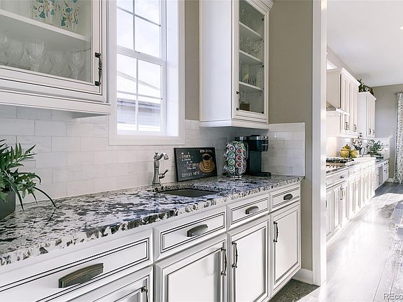 Situated on a large private lot, backing to dedicated open space, this home offers exceptional upgrades & custom finishes throughout. With over 3200 SF on the main level this home is customized for spacious & luxurious living. 10' ceilings, beautiful wide plank flooring throughout the main level, custom cased windows & 8' doors are just a few of the many features. Formal dining room featuring a tray ceiling & crown molding. Adjacent to the Dining room is a Butler's pantry with glass door cabinets, wet bar & walk-in pantry. No expense was spared in the Gourmet kitchen with upgraded & extended, white ice maple cabinetry, granite counters, a large custom cabinet center island, stainless steel appliances, double ovens, a gas cook-top with hood, & a large dining area. Natural sunlight fills this home with abundant windows in every room. Enjoy the warmth of the fireplace in the Great room with custom wood ceiling beams, tray ceiling & ceiling fan. Retreat to the Master Suite with five piece bath with quartz counters, upgraded cabinetry & a large walk-in closet. Additionally on the main level you will find a recently remodeled Jack-n-Jill bathroom with walk-in shower, two more spacious bedrooms, a laundry room with cabinets & utility sink, plenty of linen closets & a large study. The finished basement offers a large recreational room, Second Family Room with rough in for wet bar, two bedrooms (one of which could be a gym), & a full bath. Also in the basement you will find a wood shop/hobby room with ventilation system & plenty of storage space with an additional rough in for another full bath. Entertaining is made easy with plenty of outdoor living space, complete with covered patio, featuring ceiling fans & can lights, & the gentle sound of two waterfalls surrounded by ponderosa pines, green spruces, maples, bushes, perennials, & grasses. A stone walkway leads to a gas fire-pit and LED lights add ambiance at night. Enjoy peace and quiet in an all Ranch community!