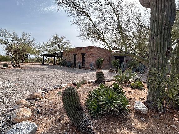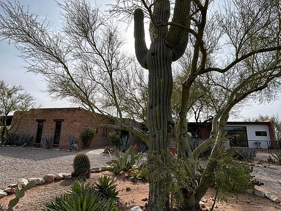 Quintessential Tucson Territorial Home with plenty of historic charm and modern comforts on a very private 1.6 acres with 365 degree views from A-Mountain to the Catalinas. There is NO HOA. The home was designed and built by the artistic husband and wife team of Tom Hill (Tucson Seven top artists) and Wanda Hill (Sculpture/metal arts-lighting). The architecture incorporates burnt adobe brick, timber beams with rough-sawn plank ceilings, and red polished concrete floors. Interiors spaces are structured around a courtyard. There are 2 master suites one with its own kitchenette and the other with an outdoor shower and fireplace. There is a 2 car garage and carports for additional covered parking. The present owners updated the bathrooms, kitchens, and HVAC in 2015. New roof in 202