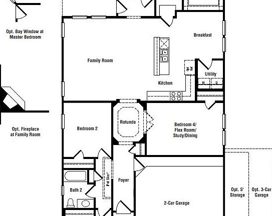 Grand rotunda foyer. Open kitchen and breakfast area. Optional corner fireplace at Family room. Flex room that can be optional 4th bedroom or study off rotunda. Large master walk in closet.