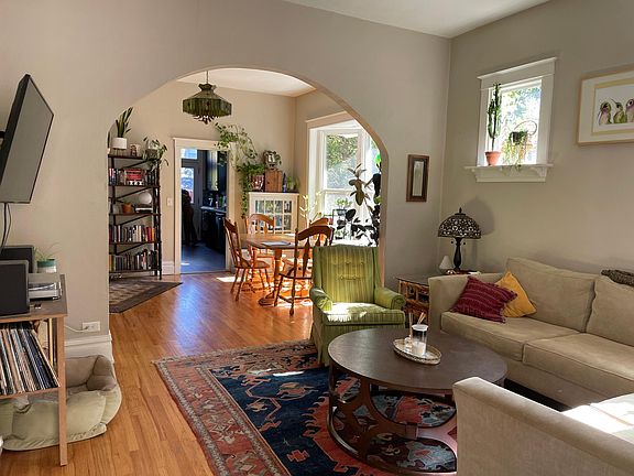 Large grass yard and ample other outdoor space, all secured by fences. Detached garage, and alley parking space in addition to ample street parking.