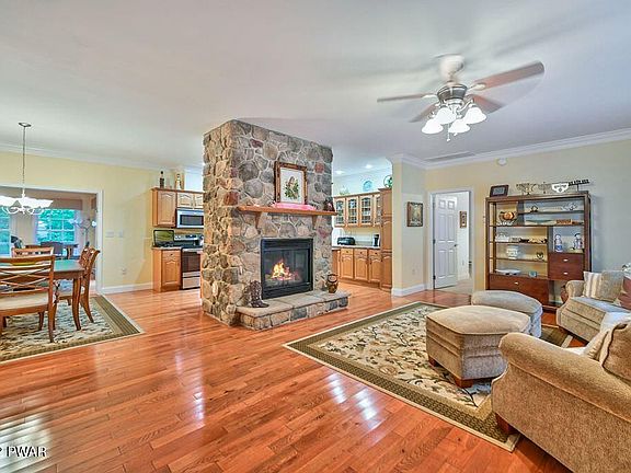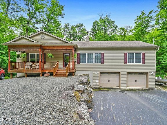 Fully Furnished beautiful ranch home built in 2008 in a four-season amenity filled community in the 'Lake Region of The Northern Poconos'. Private wooded lot with greenbelt in rear. This home has been meticulously maintained and is in pristine condition. It was built in 2008, features Central A/C, 3 bedrooms (all with walk-in-closets), 3 full bathrooms, an open floor plan, hardwood flooring, beautiful kitchen with lots of cabinets and counter space, gorgeous stone propane fireplace, large Florida room with knotty pine and lots of windows, large rear deck to enjoy the privacy of the wooded lot. One level living, Primary Bedroom with en-suite and walk in closet, and the laundry room/pantry on the main level. Full Unfinished basement framed/insulated for easy future expansion., Beds Description: 2+Bed1st, Baths: 1 Bath Level L, Baths: 2 Bath Lev 1, Eating Area: Dining Area, Eating Area: Modern KT