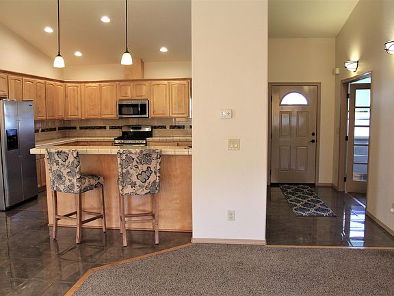 Desirable & Newer Sunset Village Home! This Spacious, Single Level Home offers a covered Front Entry, 3 Bedrooms and 2 1/2 Baths with an Open Floor Plan and Vaulted Ceilings. The Office / Bonus Room features a solid wood, built-in Wall Unit. A stacked Stone Gas Fireplace and Ceiling Fans compliment the Living Room, while the Kitchen is large and open, well designed with custom inlay Tile, and features Gas Cooking. A Breakfast bar transitions the Kitchen to the Open Dining area and Living Rooms. Non-slip Polished Stone Floors are in the Kitchen and Dining area, and Tile in all Bathrooms. The Expansive Primary Bedroom with en suite Bathroom, features a Soaking Tub, Step-in Shower, Dual Sinks and a Walk-in, organized Closet. Gas Heat & Central Air. The Finished 3-Car Garage has 8 ft doors to accommodate larger vehicles, and there is also additional RV Parking! Low maintenance Yards with Sprinklers Front & Back, and color matched Gutters complete this Gorgeous Home. Move-in Ready