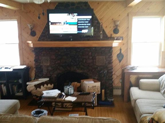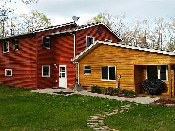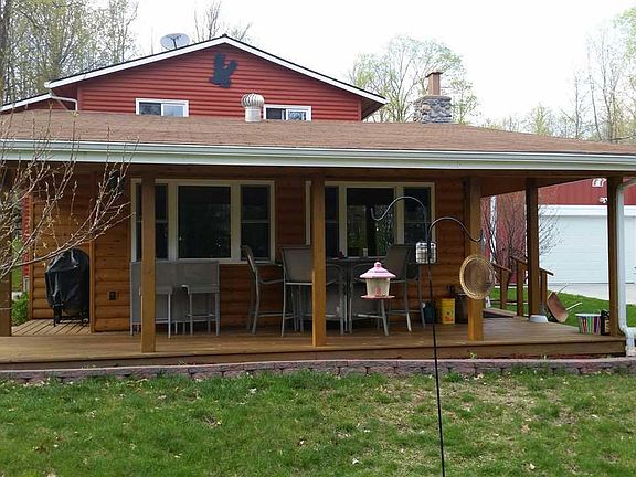 Updated and remodeled 4+ bedroom home just steps from Sugar Lake access. Many updates including: flooring, furnace, wiring, kitchen, baths, etc. Neat front sitting porch on the lake side, cement drive, garage with shop area and storage, stone fireplace and 10 acres of mostly high hardwoods, 100 yards from the best swimming beach in the area.