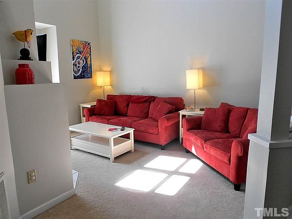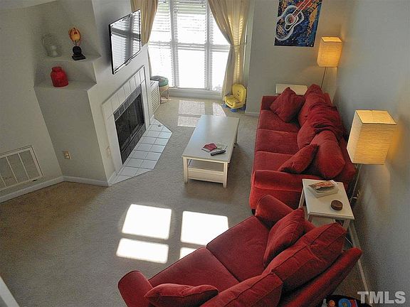 Wonderful transitional/contemporary TH located in convenient, quiet pool community offers a dramatic 2-story LR w/gas log fireplace; dining area is open to kitchen/breakfast area; covered rear porch & deck look out to a private, wooded area; spacious bedrooms have en suite baths & vaulted ceilings; master bath has been completely renovated, second bath has a new ceramic tile floor. Roof & H20 replaced in 2014. Easy access to PNC, downtown Raleigh, Cary, RTP and RDU International Airport via 440 & I-40.