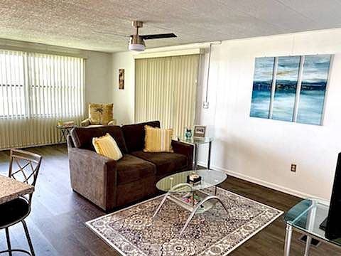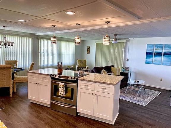 Make Offer! This beautiful two bedroom two bath mobile home comes turn-key. A nice open floor concept you will be able to entertain family and friends with ease. Some features include new subfloors and wood like Lifeproof Luxury vinyl plank flooring throughout kitchen, dining, hallway bathrooms and master bedroom.The kitchen brings updated appliances all new cabinets with plenty of storage and a beautiful island which includes granite countertops. All new bathroom cabinets, granite countertops and walk in showers. The side lanai has removable vinyl windows which will allow you to enjoy the Florida breeze year round. Let's not forget the sitting area in an additional lanai attached to carport! That provides additional space to socialize for when you chose to just sit and relax and also includes a attached storage/workshop area with washer and dryer This is a must see to appreciate! With the lot rent being $986 a month and having no homes behind you for extra privacy. It won't last long. - All listing information is deemed reliable but not guaranteed and should be independently verified through personal inspection by appropriate professionals. Agent owner - Coast to Coast Mobile Home Sales cannot guarantee or warrant the accuracy of this information, measurements, or condition of any property. Measurements are approximate. Lot rent is subject to change. Colony Cove is an age qualified (55+) five-star resort community of manufactured / mobile homes. The boasts 5 clubhouses, 5 heated pools, a riverfront pavilion and private fishing pier, a private marina, a fenced dog park (very pet friendly), tennis, shuffleboard, new pickleball courts, 2 new fitness rooms, 24-hour patrol, clubs for every interest, and much more. There are daily planned activities throughout the park. Call Brad for showing ASAP!