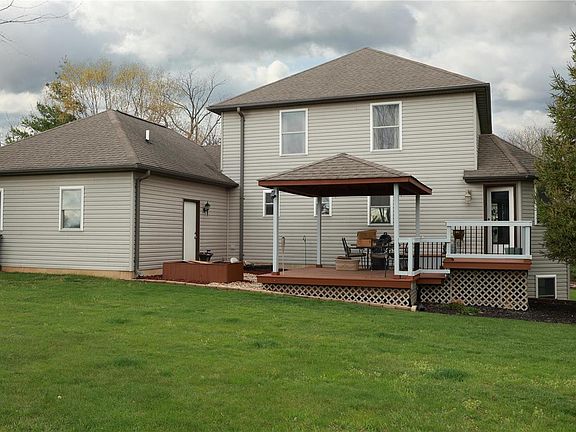 Country living close to town! You will truly love this one owner 3 bedroom, 3 bath, 3 car garage home! As soon as you walk in the front marble floor entry, you will be greeted w/the beautiful great room w/gas fireplace. To your left is the master bdrm w/built in jewelry box. From there you will walk into the mster bthrm. From the great room, you will see the kitchen, dining room & breakfast nook which takes you outside to the two patios, one covered & one not. Imagine yourself sipping coffee at sunrise and cocktails by moonlight with a view of 1.19 acres. Back inside you will walk up the custom made staircase to 2 nice size bdrms w/full bath & a sitting room overlooking the great room. Upstairs there is a sep. electric furnace which has never been used. As you walk into the basement you will see a beautiful built in rock garden below w/walk out basement just waiting to be finished. In your front yard, you will have a view of the common ground 4 acre lake for your fishing pleasure!