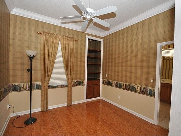 Positioned on 9th hole overlooking a pond view, this home was one of the original models, so that means a lot of extras...including a larger porch area & garage, mature trees, wood floors in dining room, library/den, & FR, crown molding in the front entry way & FR w/gas fireplace. Master suite has large walk in shower & garden spa tub, adorned w/large windows for bright open feel. Kitchen is spacious w/maple cabinets & travertine w/bronzed glass backsplash. Sold as-is.