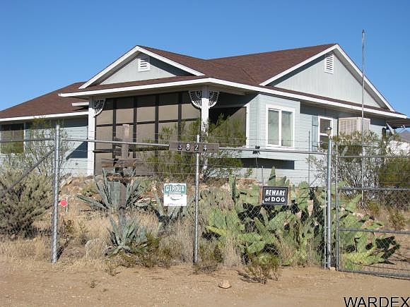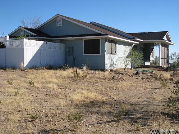 Located midway between Kingman, AZ and Laughlin NV in the Golden Sage Ranchos Subdivision of Golden Valley. This is a great location to be off the beaten track a bit but still near to the Colorado River and Gambling in Nevada. The home has low E windows, 6 in walls, ceiling fans, laminate and vinyl flooring throughout, all copper water lines, 3 storage sheds. All interior doors are 36" wide. The heating and cooling is in the 36" crawl space beneath the house. The trailer in the rear can be used for storage or guest bedroom