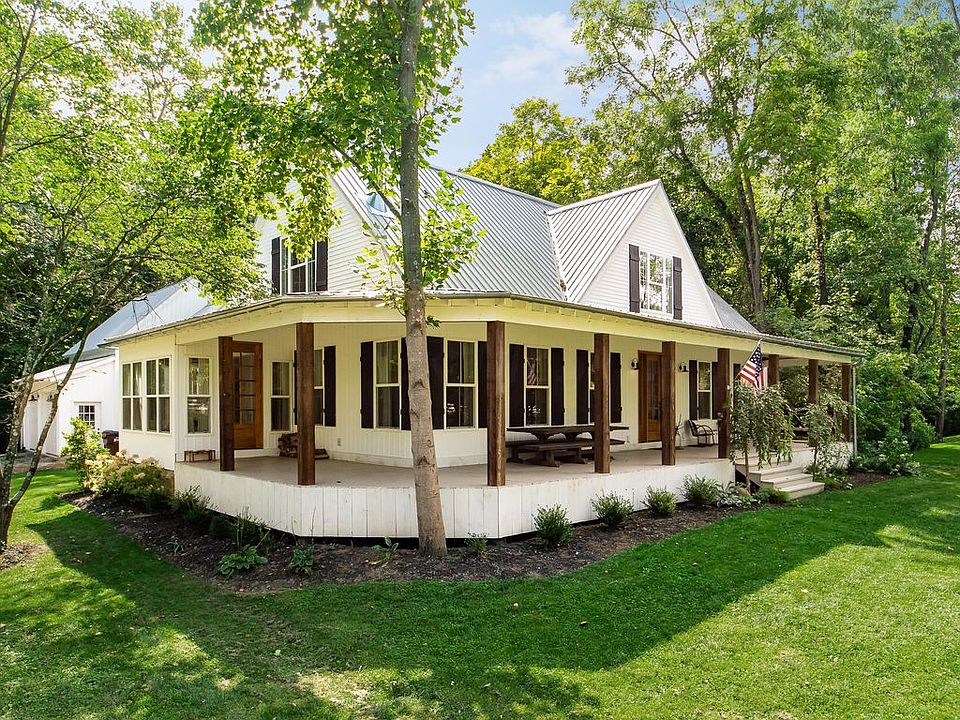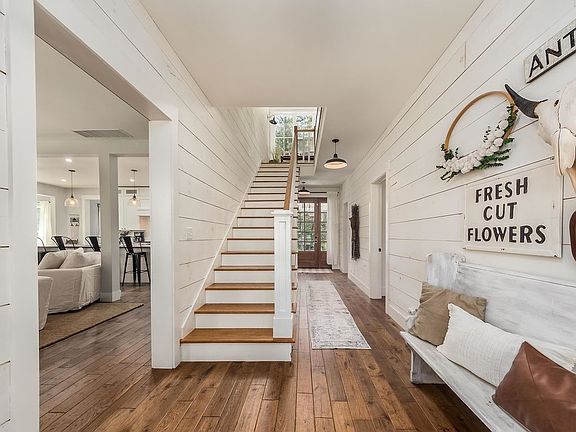 Modern farmhouse - Custom Built Home! The home is nestled on 2+ acres with mature trees & tranquil stream running through the property. The house features hardwd flrs throughout most of the home, custom handmade beveled-glass exterior drs & custom interior drs, ship lap accents, bright open floor plan w/expansive kit w/42'' cabinets w/glass accent cabinetry, huge island w/eating bar open to eating area w/walls of windows & door to the wrap-around front porch, great rm anchored by the wdburning stove & adorned by beautiful sliding barn dr, family rm w/glass dr to back porch & pool, main level master ste w/luxurious bathrm w/freestanding tub & gorgeous tile work, upstairs are twin bedrm suites, & another suite w/kitchenette. 3 zoned HVAC, generator, heated/cooled garage, & so much more!