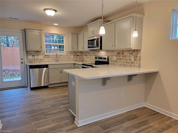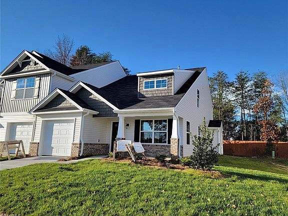 INDIANA floorplan (end unit) with Primary Bedroom on main. Grey cabinet Kitchen with stone tile backsplash. Light filled, South facing Lot backs up to trees, with added privacy from neighbor's fence!! Convenient location in North High Point, minutes from Palladium and Wendover shopping, parks and highway access. Lot 11 is complete. Call/text Kate for an appointment to visit.
