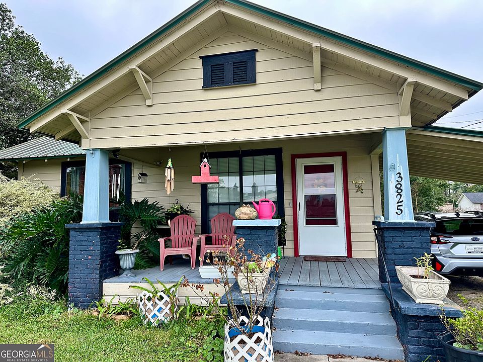 Imagine coming home to this classic Southern bungalow blending 1920s charm with modern comfort. Step inside to a welcoming living room that feels instantly inviting, with a split layout offering flexibility for your lifestyle. Two bedrooms are situated just off the main living space-connected by a doorway that makes them perfect for guests, a home office, or a creative nook. One bedroom also connects directly to the bathroom for added convenience. The kitchen offers ample cabinet space and a dining area that overlooks sliding glass doors leading to the backyard-ideal for enjoying your morning coffee or evening gatherings. A small washroom with shelving connects the dining area to the spacious primary suite, complete with an ensuite bath and large walk-in closet. Outside, the expansive backyard is ready for play, gardening, or simply relaxing under the open sky. A large storage building and a driveway easement from the side road add extra practicality. Enjoy evenings on the bungalow-style front porch or pull right into your single-car carport for easy access. Built in 1924 with an addition added in 2008, this home perfectly balances character, comfort, and space to make it truly your own.
